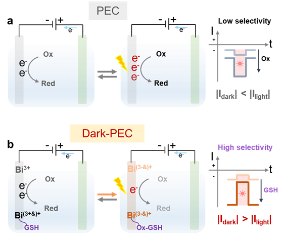 鉴于此,mk体育胡六永教授以及华中师范大学朱成周教授课题组合作在PEC系统的选择性调控与机制创新研究中取得了新进展。该团队设计并构建了一种基于溴氧化铋(BiOBr)光阴极的暗增强光电化学(dark-PEC)系统,突破了传统PEC系统光增强的固有模式。利用铋的可逆还原特性,实现了光阴极上氧还原位点的钝化与再生,成功获得了|Idark| > |Ilight|的非常规反向光电流信号。借助谷胱甘肽与BiOBr之间的选择性结合及电荷转移作用,显著提升了铋还原的可逆性,使反向光电流增强10倍,实现了光阴极对还原剂分子的选择性识别。该研究揭示了一种全新的光电化学反应机制,有效解决了传统PEC系统选择性不足的难题,显著拓展了PEC系统的应用场景,为该领域的器件设计与氧化还原过程研究提供了重要参考。