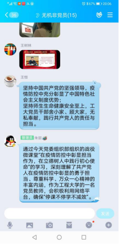 各教工党支部组织教师党员在线收看了微党课,并从教师的角度出发,进行了热烈的讨论。无机非教研室党支部党员朱丽谈到,通过收看微课堂“在疫情防控中彰显担当作为,在立德树人中践行初心使命”,深刻理解了共产党人在疫情防控中彰显的勇于担当、尊重科学、万众一心精神的丰富内涵,作为工程大学的一名党员教师,会积极利用网络平台,确保“停课不停学不减效”。