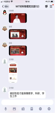 5个研究生党支部也认真进行了收看,2019级研究生第二党支部的支部书记王丹讲到,程书记的分享,让我了解到“疫情无情人有情,工大师生心连心”的生动事迹,也进一步认识到党中央和学校党委坚持集中统一领导的制度优势。对于“湖北防疫战、武汉防疫战、工大防疫战”的最终成功,我充满了信心。同时,我也将充分发挥自己作为学生党员的领导力量和模范带头作用,勇担青年责任,牢记历史使命,让青春在党和人民最需要的地方绽放绚丽之花!