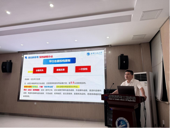 田勇详细介绍了学校整体发展情况、新高考政策、考生填报志愿的方式方法、近两年学校各专业录取人数和分数、2025年招生计划等内容,帮助与会老师全面了解学校综合情况,掌握相关政策知识,提升招生宣传技巧,更好地为考生答疑解惑。