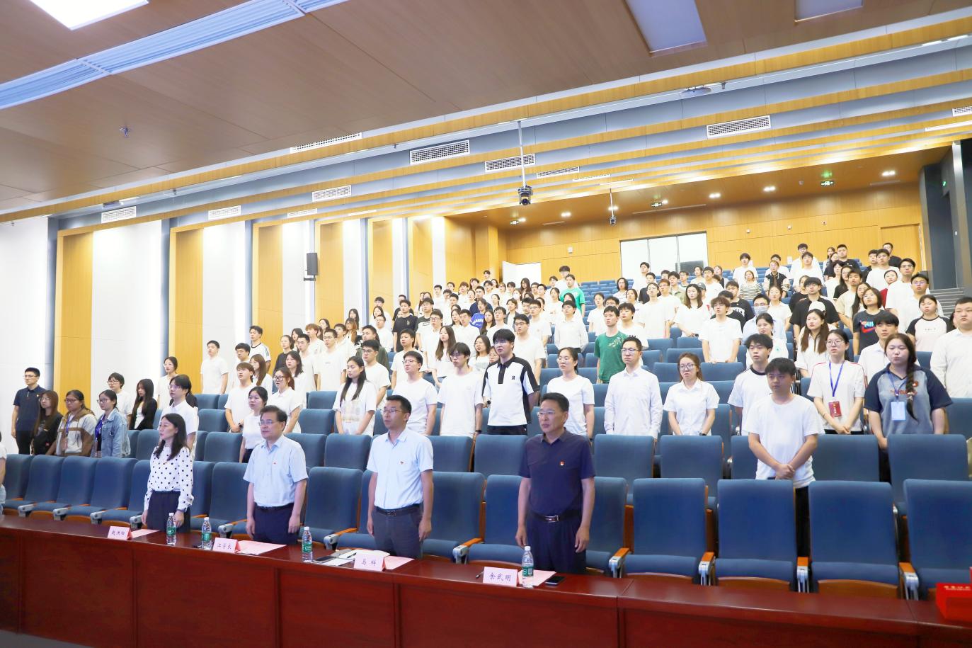 大会在国歌声中拉开帷幕。组织员余武明宣读新党员名单后,毕业生党员为新党员佩戴党徽、赠送党章,全体党员在党旗下重温入党誓词,坚定永远跟党走的决心。