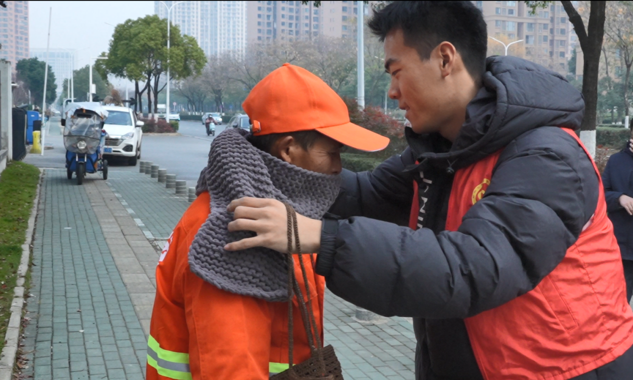 在街道上,志愿者们带着备好的手织围巾与爱心包,逐一走向仍在街头劳作的一线环卫工人。“谢谢孩子们!这十年来的坚持,戴着不光暖身子,心里更暖!”阳光洒在环卫工人与志愿者的身上,志愿者们将围巾系在他们的脖颈,将织包送上他们的肩头,彼此脸上洋溢的微笑,见证了双方心与心相连的双向奔赴。