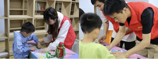 (志愿者一对一指导,孩子们沉浸式体验竹编与翻花技艺)