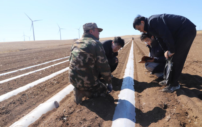 在种植现场,团队与河北慧收农业科技有限公司总经理刘立志、河北润农节水科技股份有限公司营销部部长安硕坤深入交流,针对蒙东地区风沙强、光照足的气候特点,耐心解答可降解地膜强度、降解周期、耐候性等核心疑问。团队结合实验室检测数据与农博会应用成果,详细介绍产品在自然环境下3—6个月完全降解、不残留、可肥田的优势,打消企业技术顾虑。